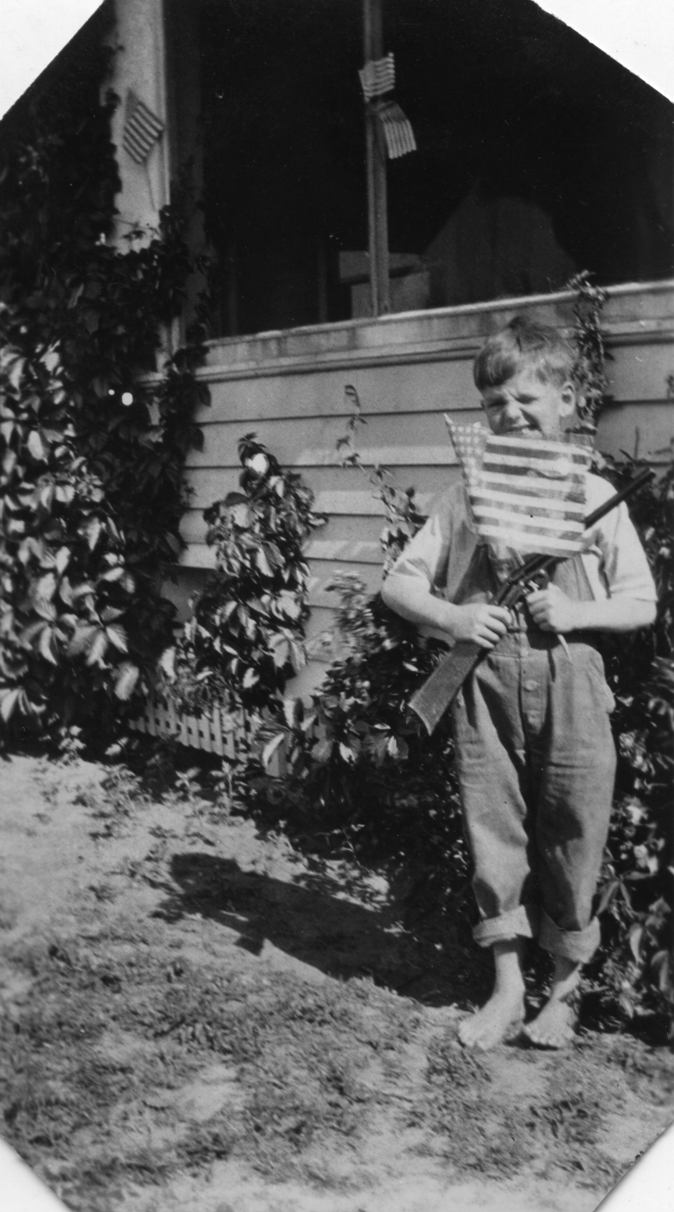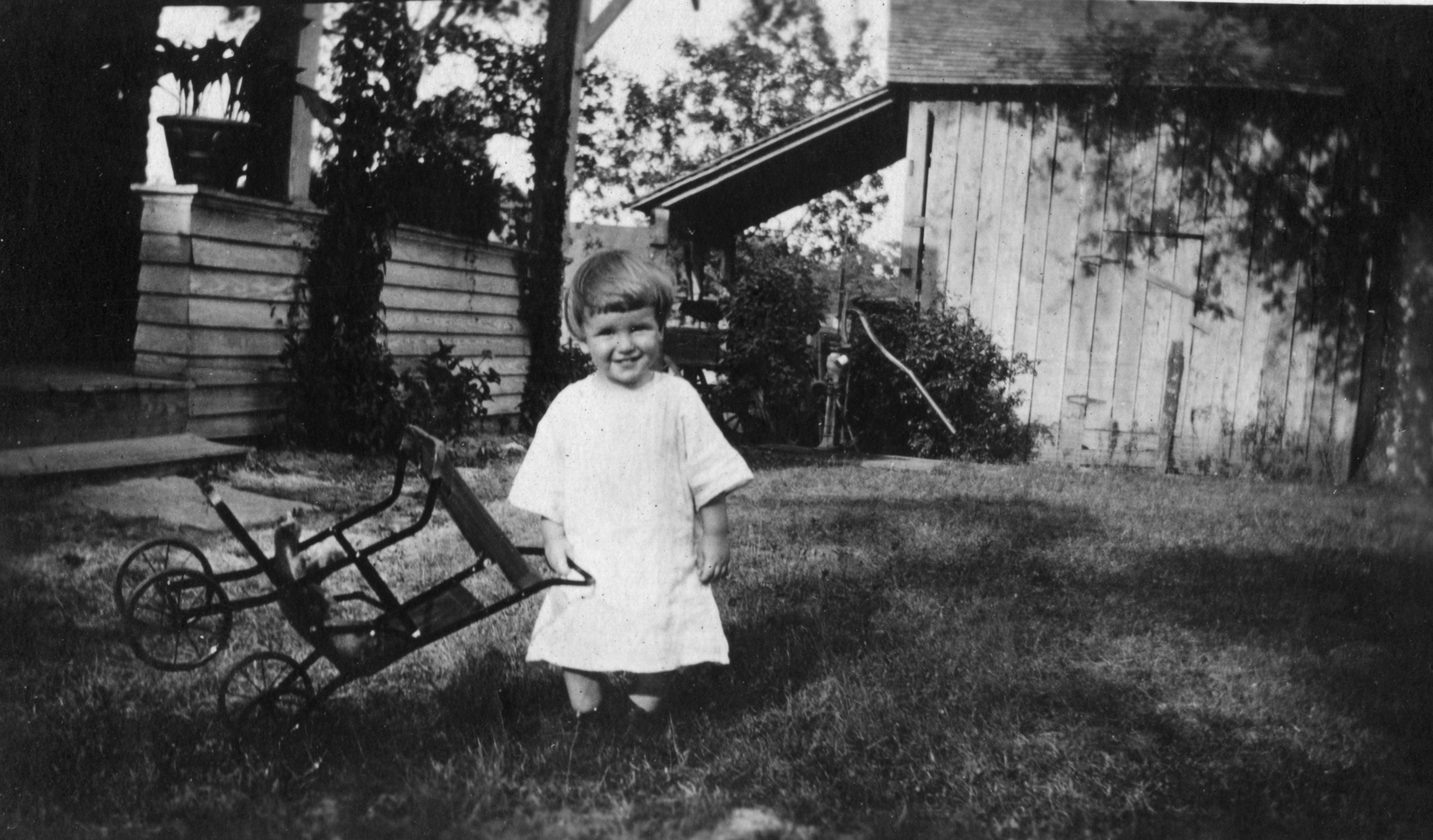 Those years in Kansas were full of family love and happiness, and I was a happy boy. The times were hard, but they were also good “growing up” days. Family pictures show me in short pants and buttonhook shoes. The farm was a wonderful place to raise a family, and during those very conservative years, we had few distractions like children have today. We made most of our own toys and seldom had anything from the store; I still have one of my store-bought painted tops with a metal spike that kept it spinning “forever.” I was good at rolling buggy wheels at the end of a stick and crossbar, and shooting an arrow in the air with a stick and string. I remember my first wagon very well. I made it myself from an old baby buggy and even hitched it up to my pony. What fun! I pretended to haul hay and do other chores just like Papa would do with his big wagon.