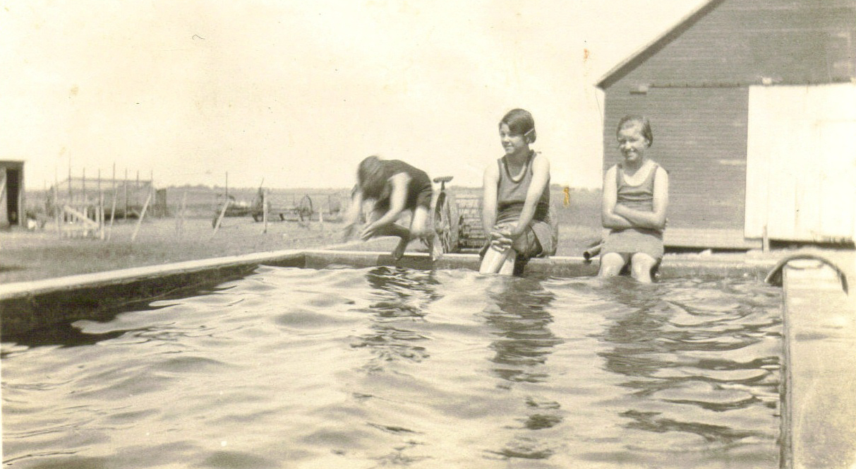 Our house on the farm was a small, two-story building with no electricity or inside plumbing; we had kerosene lamps and used an outhouse about fifty yards from the house. A windmill along with an iron-handled pump provided wonderful drinking water and also supplied the water that filled a big horse tank in the barnyard. All of us children learned to swim in that tank, and although the water was slimy at times, we didn’t care. The Kansas summers were very hot, and it felt great to get wet and cool off. I remember filling our straw hats with water and enjoying the feeling as it ran down to our toes.