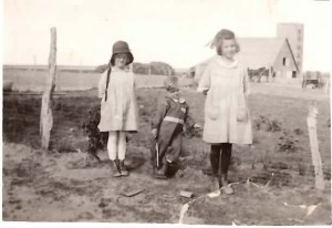 Life on the farm was pretty basic, with much of the time spent on chores. Dorothy, Marguerite, and I helped with chores at an early age — working in the garden, collecting eggs (even spotted turkey eggs), picking black cherries and mulberries, digging potatoes, pulling weeds, swatting flies, feeding rabbits and chickens, pitching straw during the wheat harvest, and tending the milk cows along the roadside when Papa let them out to graze. I remember the bull chasing Billy because he looked like a Holstein cow — black and white. I also remember working to get the Mexican sand burrs off of the dirt tennis court that we had built beside the house. Because we were running around barefooted most of the time, we had to contend with the rattlesnakes, prairie dog holes, nettles and burrs, and sharp stones. Our feet got pretty tough and black, of course.